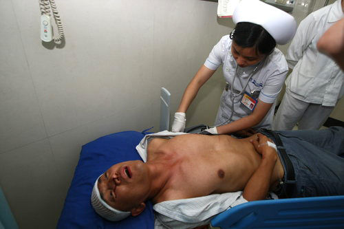 目擊于小龍被執(zhí)法人員毆打的小販林先生告訴記者,突然間4名身穿制服的執(zhí)法人員沖過(guò)來(lái)沒(méi)收東西。于小龍想從執(zhí)法人員手里搶回貨,卻換來(lái)一頓暴打!皾M(mǎn)臉都是血!绷窒壬f(shuō)。記者在南城醫(yī)院看到于小龍?zhí)稍诖采仙胍,頭腦還比較清醒,稱(chēng)打傷他頭部的是執(zhí)法人員手持的DV機(jī)。