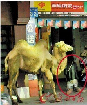 13日下午1時許,一名青年男子拉著一頭駱駝,沿著廣州豐樂路行乞。男子在每一家店鋪前停下,甚至下跪不起(見圖紅圈所示),只為收取各家各戶5角至1元的“打發(fā)費”。男子年約二三十歲,大熱天里仍穿著長袖深色衣裝,全身發(fā)出霉味。被他拉著招搖過市的是一頭雙峰駱駝,高近兩米,顯得很溫順。