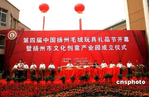 5月18日上午,“第四屆中國揚(yáng)州毛絨玩具禮品節(jié)在五亭龍國際玩具禮品城開幕,舉行揚(yáng)州市文化創(chuàng)意產(chǎn)業(yè)園成立、揚(yáng)州市五亭龍國際玩具精品館開館儀式,同時(shí)啟動(dòng)揚(yáng)州市文化創(chuàng)意產(chǎn)業(yè)聯(lián)盟。中國禮儀用品工業(yè)協(xié)會副理事長、秘書長曾會師,揚(yáng)州副市長王玉新,維揚(yáng)區(qū)委書記姚蘇華等領(lǐng)導(dǎo)和來自海內(nèi)外數(shù)百名玩具采購商參加,開幕式由維揚(yáng)區(qū)長楊蓉主持。中新社發(fā) 崔佳明 攝