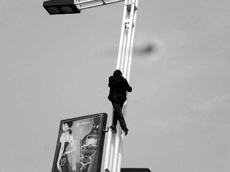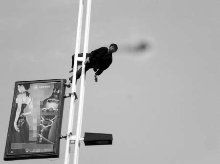 5月16日14時(shí)45分,許昌市(河南)消防支隊(duì)禹州大隊(duì)接到報(bào)警,位于禹州市濱河路東段歐蔓咖啡廳對(duì)面一路燈桿上有人要自殺。消防官兵趕到現(xiàn)場(chǎng)發(fā)現(xiàn),一名約40歲左右,操外地口音的男子在路燈桿頂部,一會(huì)兒躺在路燈桿頂部的燈罩架上做出睡覺姿勢(shì),一會(huì)兒抓住燈罩架蕩起“秋千”。