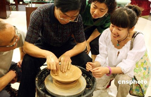 5月28日,中國傳統(tǒng)端午節(jié)之際,來自中國龍泉的青瓷陶藝大師在北京合璧興陶瓷藝術(shù)館舉行“最具有潛力的中青年青瓷大師作品展”,陶藝大師徐定昌在現(xiàn)場與收藏愛好者交流,F(xiàn)代浙江龍泉青瓷自2008年中國嘉德秋季藝術(shù)品拍賣會(huì)首次登場,2009年春季拍賣會(huì)四位大師作品將聯(lián)袂登臺(tái),是次作品展專門展售同毛正聰大師一起來京參拍的徐定昌、陳愛明、盧偉孫三位大師的作品。中新社發(fā) 錢興強(qiáng) 攝