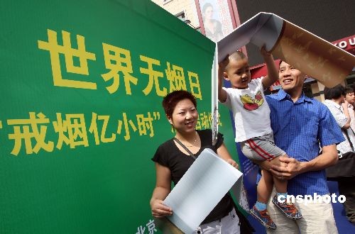 5月29日,一個(gè)家庭在北京王府井大街將香煙模型撅斷,這是由北京市愛衛(wèi)會(huì)主辦的世界無煙日暨“戒煙億小時(shí)”公益活動(dòng)現(xiàn)場(chǎng)。該活動(dòng)發(fā)出“戒煙一小時(shí),健康億人行”的戒煙口號(hào),號(hào)召“世界無煙日”(5月31日)當(dāng)天17點(diǎn)31分至18點(diǎn)31分之間戒煙一小時(shí)。據(jù)悉,中國是世界上煙草生產(chǎn)和消費(fèi)第一大國,目前約有3.5億吸煙者,并且還在以每年300萬的速度增長,控?zé)熜蝿?shì)極為嚴(yán)峻。中新社發(fā) 張宇 攝