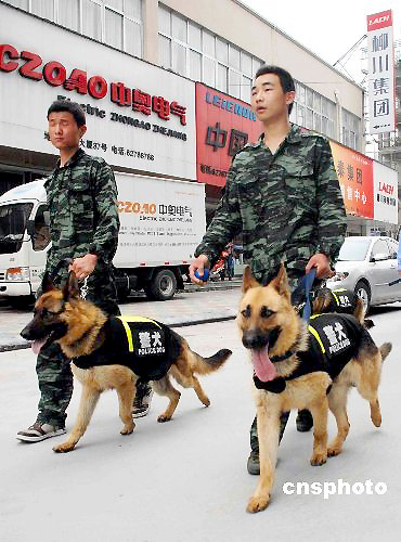 近日,浙江溫州市樂清公安局首次將警犬投入到社會治安管理中。首批4條警犬分為兩組:一組負責樂清柳市車站周邊的巡邏,另一組配合警方設(shè)卡和對可疑人員的追蹤、圍堵。2009年4月份,樂清警方專門成立了警犬基地,由保安公司負責飼養(yǎng)與日常管理。目前,警犬基地已從南京軍區(qū)購買20只警犬,每只身價都在萬元以上,多為體型強壯勻稱、勇敢無畏的德國牧羊犬。據(jù)介紹,這20只護衛(wèi)犬主要用于溫州樂清的警戒、巡邏等,其中4只首批受訓成功投入使用。中新社發(fā) 許勛磊 攝