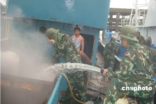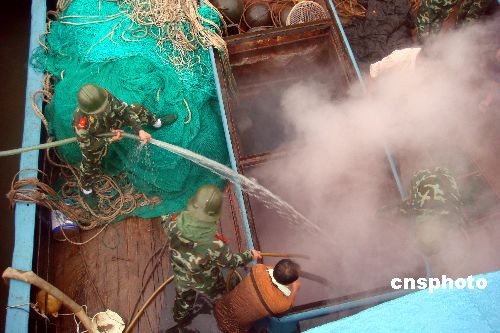 6月10日傍晚5時許,浙江省溫州市鹿西島一艘停泊在港內(nèi)休漁的鋼質(zhì)漁輪因電線老化引發(fā)大火,火勢迅速從中艙向外蔓延,隨時可能危及到停靠在一起的20多艘漁船。發(fā)現(xiàn)險情后,鹿西邊防派出所官兵迅速攜帶滅火裝備趕赴火災(zāi)現(xiàn)場救援,附近漁民也紛紛加入滅火隊伍。經(jīng)過一個多小時的奮力撲救,大火最終被完全撲滅,所幸未造成人員傷亡。中新社發(fā) 吳水斌 攝