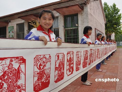 6月17日,在山東博興縣興福鎮(zhèn)村魏小學(xué),歷經(jīng)近兩個(gè)月的時(shí)間,由該校刻紙興趣小組小學(xué)生集體制作的刻紙作品《水滸一百單八將》全部刻制完成。這幅作品全長(zhǎng)38米,寬0.6米,容納進(jìn)了宋江、林沖、魯智深等梁山好漢108人刻紙像。作品以剪紙與刀工技藝結(jié)合手法,形象表現(xiàn)了我國(guó)古代四大名著《水滸傳》中108位“梁山好漢”的個(gè)性。中新社發(fā) 陳彬 攝
