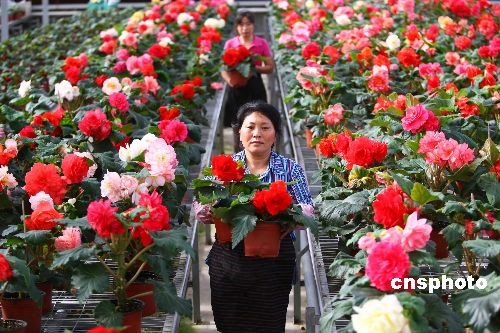 6月22日,在北京草橋楊鎮(zhèn)花卉基地一位花卉工人正在手捧朝鮮“金正日花”從海棠花中走過(guò)。據(jù)草橋基地負(fù)責(zé)人介紹“金正日花”屬于海棠科多年生球根花,是日本花卉專家加茂元照經(jīng)過(guò)多年研究培育出來(lái)的。在1988年送給朝鮮領(lǐng)導(dǎo)人金正日,作為領(lǐng)袖46歲生日的禮物,并以金正日命名。民眾可以在今年9月26日召開的第七屆中國(guó)花卉博覽會(huì)上一睹它的芳容。為了確!敖鹫栈ā蹦茉诨ú⿻(huì)上如期盛開,楊鎮(zhèn)草橋基地專門從朝鮮聘請(qǐng)了3名專業(yè)技術(shù)人員,他們對(duì)“金正日花”的生長(zhǎng)溫度、適度控制非常嚴(yán)格,給花澆水、施肥都要按照嚴(yán)格的標(biāo)準(zhǔn)執(zhí)行。目前,“金正日花”長(zhǎng)勢(shì)喜人。中新社發(fā) 富田 攝