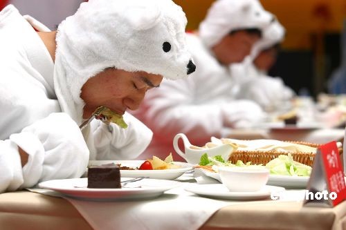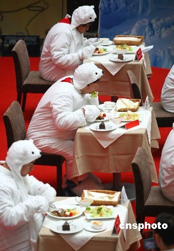 7月4日,一項關(guān)注全球變暖的時尚環(huán)保比賽在北京一購物中心舉行,比賽者身披厚厚的毛皮、頭戴北極熊頭套,在千瓦鎢絲燈光的烤射下,比賽吃西式牛排套餐。活動旨在倡導(dǎo)都市潮人們在享受時尚浪漫生活的同時,不忘“環(huán)保、減碳、愛地球”,關(guān)注“地球均溫如升高6度,冰川融化,不只北極熊將失去家園,地球也將面臨毀滅”的現(xiàn)實話題。中新社發(fā) 富田 攝