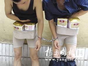 14日下午3點半左右,兩名男子在南京建寧路一家超市里偷了4聽奶粉藏在內(nèi)褲里準(zhǔn)備偷運出超市。在超市門口被保安發(fā)現(xiàn)后,兩人四處逃竄,其中一人跑到奶粉貨架處,脫了褲子就把奶粉放回貨架上,但還是被保安和熱心的市民抓住。令人啼笑皆非的是,偷奶粉的兩名男子竟然各穿了三條女性緊身內(nèi)褲方便作案。