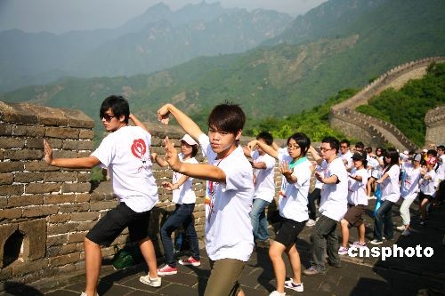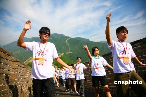 7月15日,兩岸青少年正在北京懷柔慕田峪長城舞太極。當日,北京市人民政府臺灣事務(wù)辦公室與懷柔區(qū)人民政府在懷柔慕田峪長城舉辦“兩岸青年舞動太極聚長城”活動,臺灣大學、臺中技術(shù)大學、基隆市二信中學、嘉義東石學校、新竹中信學校等院校的學生,國民黨青年發(fā)展基金會、臺灣工藝發(fā)展協(xié)會等社會團體組織成員,與北京600余名師生歡聚長城共舞太極。本次活動是“青春牽兩岸,十年大聚首——京臺青少年交流周”活動重要組成部分,旨在發(fā)揚中華民族傳統(tǒng)文化,聯(lián)絡(luò)兩岸師生感情,讓長城見證兩岸青少年的友情地久天長。中新社發(fā) 卜向東 攝