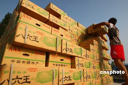 7月24日,新疆特產(chǎn)哈密瓜在北京新發(fā)地農(nóng)貿(mào)市場熱銷。時至盛夏,新疆的各色水果正陸續(xù)成熟,在當?shù)毓r(nóng)喜迎豐收的同時,相關(guān)政府部門采取措施幫助他們打開銷路。7月21日,國家商務(wù)部和新疆維吾爾自治區(qū)政府在烏魯木齊組織召開“新疆農(nóng)產(chǎn)品產(chǎn)銷對接洽談會”,來自廣東、北京等地的19家大型農(nóng)產(chǎn)品批發(fā)零售企業(yè)與當?shù)毓⿷?yīng)商及生產(chǎn)基地簽訂近40萬噸的采購協(xié)議。中新社發(fā) 富田 攝