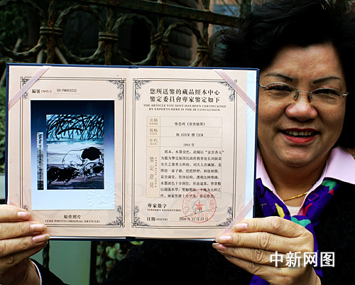 在2009年12月底,這幅畫送權(quán)威機構(gòu)北京中博文物檢測鑒定中心鑒定,經(jīng)資深文物鑒定專家陳行一先生鑒定,確認為徐悲鴻大師的真跡。陳行一在鑒定意見中還寫道:“劉夫人亦屬豬,是圖繪一家子豬,肥肥胖胖,相依相偎,富貴滿堂。形體結(jié)構(gòu)、透視比例準確,水墨淡色十分到位,形態(tài)逼真。背景敷以湖蕩水草,筆觸簡練,不愧為大師之作。畫家作豬十分罕見,彌足珍貴!