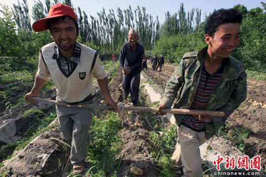 6月2日,新疆喀什地區(qū)澤普縣維吾爾族農(nóng)民正在田間收獲早熟土豆。該縣共種植早熟土豆4萬余畝,畝產(chǎn)1500公斤左右,每畝地至少可為當(dāng)?shù)剞r(nóng)民增加收入3000元人民幣。據(jù)該縣政府工作人員介紹,該縣早熟土豆的陸續(xù)上市,也為平抑了虛高的蔬菜價(jià)格起到了作用。