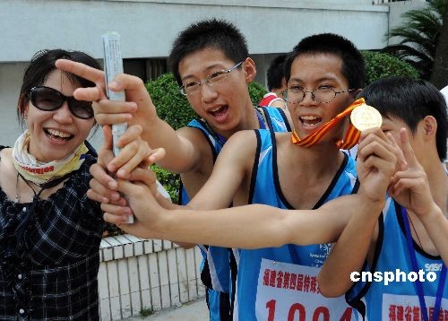 6月7日,中華臺(tái)北代表團(tuán)部分田徑選手及教練共同為臺(tái)北選手丁啟文(右二)在福建省第四屆特奧會(huì)男子400米決賽中奪得金牌歡呼慶賀。為期兩天的福建省第四屆特殊奧林匹克運(yùn)動(dòng)會(huì)6日在福州開賽,中華臺(tái)北代表團(tuán)首次應(yīng)邀參加福建省特奧會(huì),這也是臺(tái)灣智障運(yùn)動(dòng)員首次到大陸參加特奧會(huì)。中新社發(fā) 劉可耕 攝