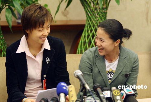 十月十七日,中共十七大代表、乒乓球運動員王楠、張怡寧在北京梅地亞中心接受中外媒體采訪。當(dāng)有記者問及訓(xùn)練以外的生活細節(jié)時,二人相視而笑。中新社發(fā) 毛建軍 攝