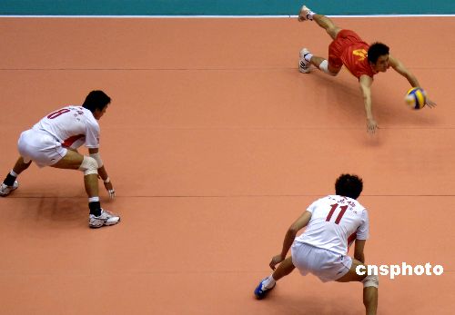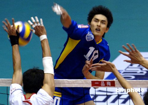 10月20日,在江蘇省淮安市舉行的2007-2008年安踏全國(guó)排球聯(lián)賽上,江蘇男排1:3不敵上海男排。中新社發(fā) 曹政 攝