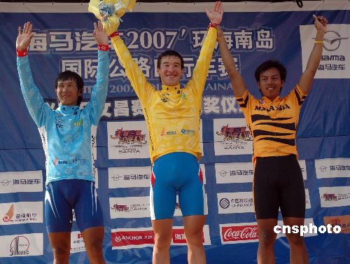 11月5日,“海馬汽車”2007環(huán)海南島國(guó)際公路自行車賽舉行第二賽段興隆—文昌賽段。俄羅斯選手(中)丹尼斯·格林姆西亞諾夫蟬聯(lián)個(gè)人總成績(jī)領(lǐng)先者、沖刺積分領(lǐng)先者兩個(gè)獎(jiǎng)項(xiàng),馬來(lái)西亞選手阿奴爾·馬南(右)獲得第二賽段分段冠軍,中國(guó)國(guó)家隊(duì)選手馬海軍(左)蟬聯(lián)亞洲最佳選手。中新社發(fā) 彭小云 攝