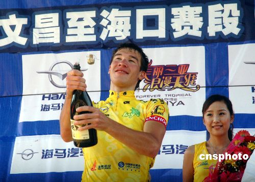 11月6日,2007年環(huán)海南島國際公路自行車賽進(jìn)行了第三賽段文昌至海口125公里的比賽,俄羅斯隊(duì)車手丹尼斯·格林姆西亞諾夫以2小時(shí)55分13秒的成績獲得該賽段冠軍,并以11小時(shí)10分50秒的成績獲得個(gè)人總成績第一名,繼續(xù)保有黃色領(lǐng)騎衫。中新社發(fā) 善平 攝