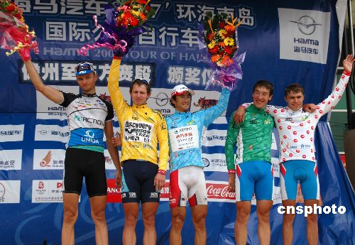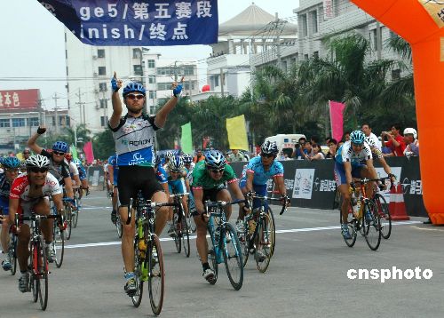 十一月八日,“海馬汽車”二00七環(huán)海南島國際公路自行車賽進行第五賽段儋州至東方一百六十八公里的比賽,波蘭隊四號車手羅伯特·仁多士(前左二)獲得本賽段冠軍。中新社發(fā) 尹海明 攝