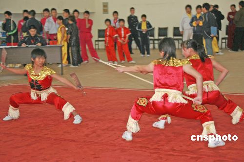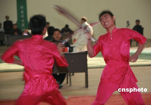 2007年11月19日,為期3天的“2007中國安徽首屆傳統(tǒng)武術(shù)大會(huì)暨武術(shù)套路國際邀請賽”在安徽省黃山市舉行。本次比賽分為傳統(tǒng)武術(shù)和武術(shù)套路兩個(gè)部分,其中有個(gè)人單項(xiàng)、個(gè)人全能比賽;有傳統(tǒng)拳術(shù)、傳統(tǒng)器械、對練3個(gè)項(xiàng)目。來自中國、美國、澳大利亞、波蘭、日本、新加坡、加蓬、越南、菲律賓、古巴和中國香港等十多個(gè)國家和地區(qū),共有43支代表隊(duì)的439名運(yùn)動(dòng)員參加比賽。中新社發(fā) 方也廣德 攝
