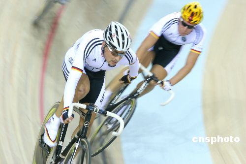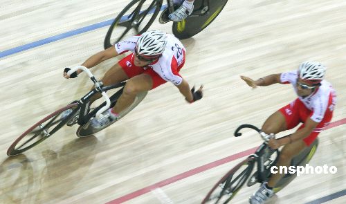 12月9日,“好運(yùn)北京”2007-2008國(guó)際自盟場(chǎng)地自行車世界杯賽在老山自行車館閉幕。圖為最后一項(xiàng)男子麥迪遜40公里的決賽。在男子麥迪遜賽中,每隊(duì)有兩名選手組成,是完成途中沖刺的比賽。根據(jù)各隊(duì)完成比賽的距離和所獲得的沖刺得分,可以決定最終的名次。此外,如果一支隊(duì)伍能夠領(lǐng)先其他車隊(duì)一圈或一圈以上,那無(wú)論沖刺得分是多少都將獲勝。中新社發(fā) 富田 攝