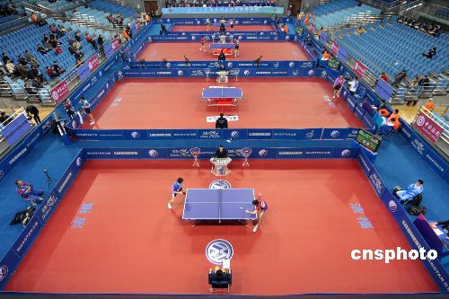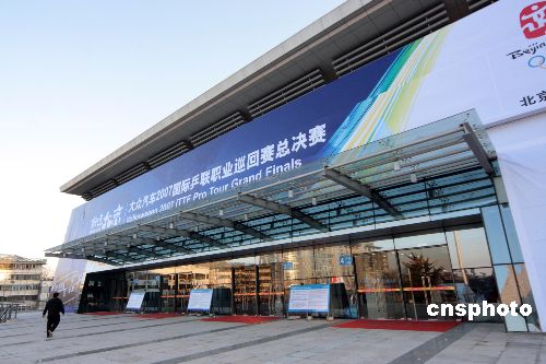12月13日,新近落成的北京大學(xué)奧運乒乓球館迎來“好運北京”2007年ITTF職業(yè)巡回賽總決賽。奧運乒乓球館可提供固定與活動座位共7557座,其中位于首層的比賽場地長47米,寬39.5米,最多可布置8張乒乓球臺同時進(jìn)行比賽。放入活動座椅后,賽場變?yōu)殚L27米,寬20米,可放置2張乒乓球臺進(jìn)行比賽。中新社發(fā) 吳芒子 攝