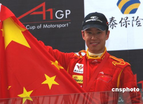 A1GP世界杯汽車大獎(jiǎng)賽2007/08賽季中國站12月16日在珠海國際賽車場舉行,在沖刺賽的比賽中,A1中國隊(duì)車手程叢夫表現(xiàn)出色獲得第三名,五星紅旗高高飄揚(yáng)珠海國際賽車場。中新社發(fā) 趙振清 攝