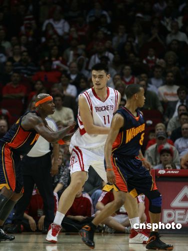 休斯頓火箭隊三十一日晚在主場豐田體育中心以九十五比一百一十二負于來訪的金州勇士隊。姚明在比賽中僅有八次出手,得到了十六分。阿爾斯通拿下火箭隊當(dāng)晚最高的二十二分。圖為當(dāng)日的比賽。中新社發(fā) 楊晉生 攝