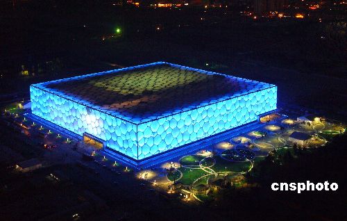 2008年1月31日傍晚,俯瞰“水立方”宛若一座美麗的“水晶宮” 晶瑩剔透,其冰清玉潔的芳姿令人陶醉。當日,好運北京測試賽在此拉開帷幕。中新社發(fā) 玉龍 攝