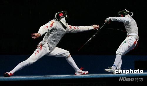 4月18日,“好運北京”2008國際劍聯(lián)世界錦標賽在國家會議中心擊劍館打響,首先進行的是男子花劍團體的比賽,在1/4決賽中,雅典奧運會團體金牌得主意大利隊(右)以45-33的比分戰(zhàn)勝了東道主中國隊(左),率先挺進4強。中新社發(fā) 富田 攝