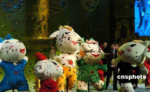 二十八日晚,廣州亞運(yùn)會吉祥物在白云國際會展中心發(fā)布。吉祥物取名“樂羊羊”,形象是運(yùn)動時(shí)尚的五只羊,分別取名“阿祥”、“阿和”、“阿如”、“阿意”、“樂羊羊”,組成“祥和如意樂洋洋”,表達(dá)了廣州亞運(yùn)會將給亞洲人民帶來“吉祥、和諧、幸福、圓滿和快樂”的美好祝愿,同時(shí)也傳達(dá)該屆運(yùn)動會“和諧、激情”的理念。中新社發(fā) 柯小軍 攝