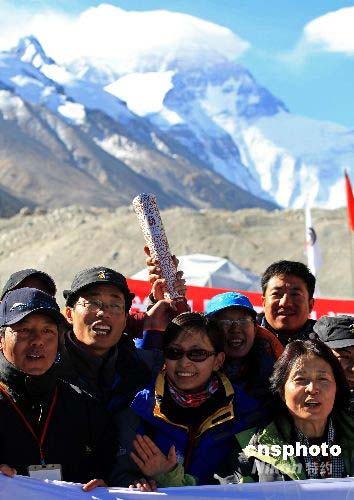 圖:珠峰大本營(yíng)工作人員等手舉“祥云”