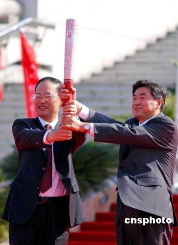 五月十二日上午,北京奧運會火炬在福建省泉州市閩臺緣博物館廣場開始傳遞。圖為新上任的泉州市委書記徐鋼(左)從北京奧組委火炬接力中心副主任劉寶杰手中接過“祥云”。中新社發(fā) 傅丹丹 攝