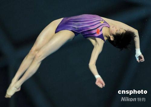 5月30日,2008年國際泳聯(lián)美的世界跳水系列賽女子十米臺決賽在南京奧體中心游泳館進(jìn)行,中國選手陳若琳獲得冠軍。世錦賽冠軍王鑫由于在第一跳出現(xiàn)重大失誤得到零分,最終與獎牌無緣。中新社發(fā) 劉建民 攝