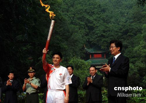 6月4日,奧運(yùn)會(huì)跳水冠軍、湖南省體育局的副局長熊倪在愛晚亭前從湖南省委書記張春賢手中接過火炬,開始奧運(yùn)圣火長沙站傳遞。中新社發(fā) 廖攀 攝