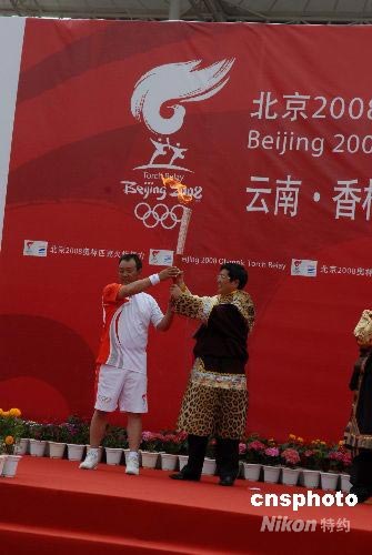 6月11日9時(shí)20分,奧運(yùn)圣火在云南香格里拉開始傳遞,香格里拉縣縣長肖徐(右)把首棒火炬交給藏族火炬手馬八金,這是奧運(yùn)圣火首次在中國藏區(qū)傳遞。中新社發(fā) 石雨 攝