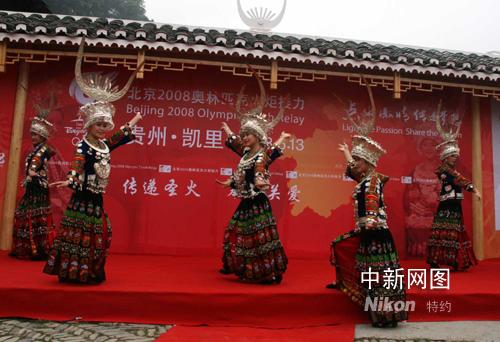 圖:苗族姑娘載歌載舞喜迎奧運(yùn)火炬