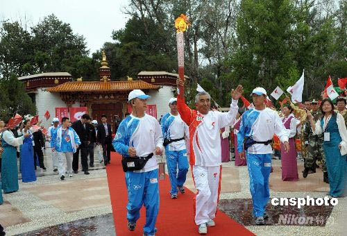 北京奧運(yùn)會火炬二十一日九時(shí)十分許在西藏自治區(qū)首府拉薩開始傳遞,第一次從北坡登上珠峰的藏族登山老英雄貢布擔(dān)任第一棒。此次拉薩傳遞共一百五十六名火炬手,其中包括七十八名以藏族為主題的少數(shù)民族和一名外籍人士。傳遞起點(diǎn)設(shè)在有“寶貝園林”之稱的羅布林卡廣場。 中新社發(fā) 廖攀 攝