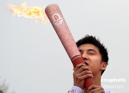 7月4日,奧運(yùn)火炬在陜西西安傳遞,中國(guó)著名跳水運(yùn)動(dòng)員田亮作為西安第一棒火炬手在小雁塔下深情親吻奧運(yùn)火炬。 中新社發(fā) 廖攀 攝