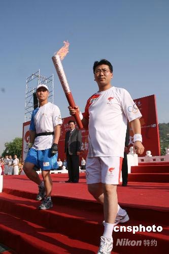 7月7日,北京奧運火炬在蘭州進(jìn)行傳遞,第一棒火炬手是抗震救災(zāi)英雄田宇。田宇是甘肅省隴南市徽縣嘉陵鎮(zhèn)政府武裝部部長,在“5·12”地震中,他帶領(lǐng)民兵搶救出8名受困群眾。 中新社發(fā) 周兆軍 攝