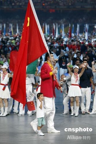 8月8日,第29屆夏季奧運會在北京奧林匹克公園內(nèi)的國家體育場“鳥巢”舉行。中國代表團(tuán)的旗手是著名籃球運動員姚明,走在姚明身邊的是獲得英雄少年的光榮稱號的四川省阿壩州映秀鎮(zhèn)漁子溪小學(xué)二年級學(xué)生林浩。中國體育代表團(tuán)派出了1099人的龐大陣容,將參加全部28個大項的比賽。中新社發(fā) 杜洋 攝