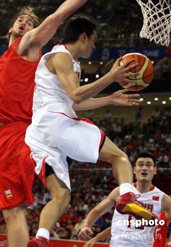 北京奧運(yùn)會男子籃球小組賽第二輪賽事8月12日開始,首戰(zhàn)負(fù)于“夢八隊”的中國男籃在姚明率領(lǐng)下向世錦賽冠軍西班牙隊發(fā)起猛攻,在一路領(lǐng)先的大好局面下被西班牙隊在終場時扳平,經(jīng)過加時賽以75比85告負(fù)。中新社發(fā) 任晨鳴 攝