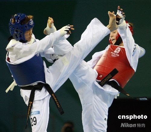 8月21日,北京奧運(yùn)跆拳道女子57公斤級(jí)比賽在北京科技大學(xué)體育館舉行,在銅牌爭(zhēng)奪賽中,中華臺(tái)北隊(duì)蘇麗文(藍(lán)方)不敵克羅埃西亞選手。中新社發(fā) CNAsports 攝