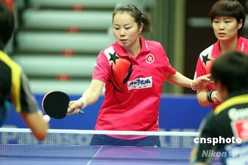 9月14日,2008年國(guó)際乒聯(lián)職業(yè)巡回賽中國(guó)乒乓球公開賽在上海舉行。香港選手帖雅娜(左)與隊(duì)友姜華珺在女子雙打的比賽中,在落后3局的情況下,上演大逆轉(zhuǎn)以4:3戰(zhàn)勝中國(guó)選手郭躍與李曉霞組合,獲得冠軍。中新社發(fā) 湯彥俊 攝