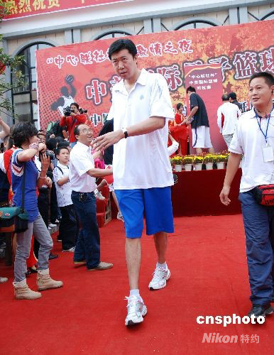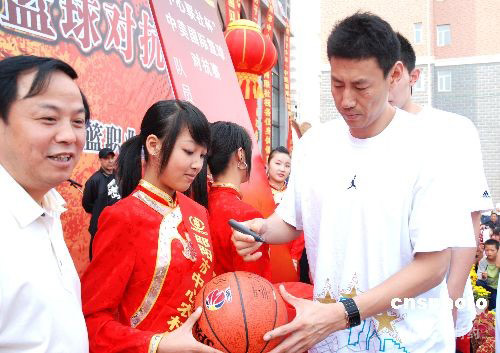 10月5日,“中心聯(lián)社杯”中美國際男子籃球?qū)官惖年爢T抵達湖南邵陽。在當(dāng)日舉行的球星球迷見面會上,王治郅、李楠等國內(nèi)外球星使場面異;鸨。中新社發(fā) 呂建設(shè) 攝