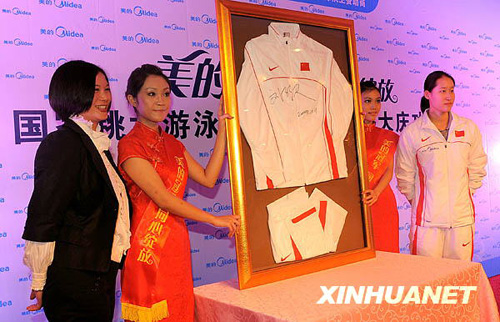 10月12日,中國國家跳水隊、游泳隊在廣東順德舉行“慶功慈善拍賣晚宴”。奧運冠軍郭晶晶、劉子歌等將所拍賣運動裝備61.4萬元捐贈給中國紅十字會“奧運之星”保障基金。新華社記者陳曉偉攝