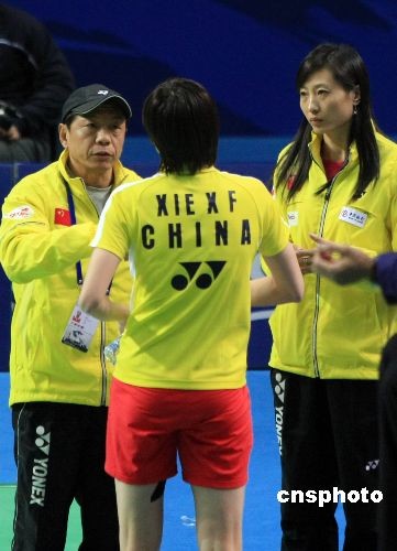11月19日,在上海舉行的2008年中國羽毛球公開賽展開正賽首輪爭奪,中國羽壇老將、北京奧運會女單冠軍張寧(圖右),上任國家隊女單教練后首次亮相賽場督戰(zhàn),格外引人關(guān)注。中新社發(fā) 湯彥俊 攝