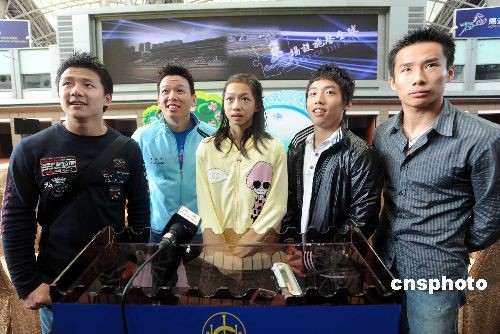 十一月二十日,北京奧運(yùn)金牌運(yùn)動員代表團(tuán)再度訪港,并獲邀出席香港沙田馬場三十周年祝愿儀式。圖為奧運(yùn)體操金牌運(yùn)動員(左起)陳一冰、黃旭、江鈺源、鄒凱及肖欽接受媒體訪問。中新社發(fā) 鄧慶樂 攝