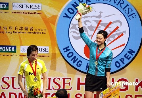十一月三十日,中國(guó)香港選手王晨在香港公開(kāi)羽毛球超級(jí)賽女單決賽中以二比一戰(zhàn)勝中國(guó)選手謝杏芳,奪得冠軍。中新社發(fā) 武仲林 攝