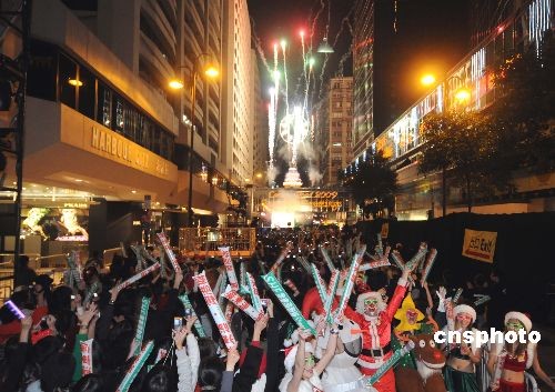十二月二十四日晚(平安夜),逾十萬市民及游客齊聚香港尖沙咀鬧市,參加圣誕倒數(shù)街頭派對(duì),圣誕老人、圣誕女郎及雪人在場(chǎng)助興,節(jié)日氣氛濃厚。中新社發(fā) 蔡蔓莉 攝