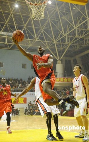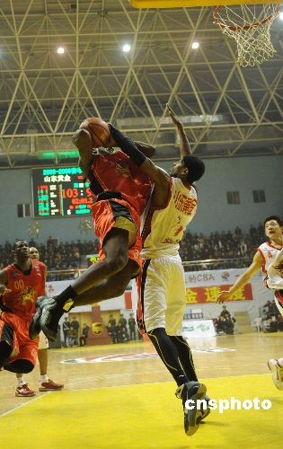 2月6日,2008—2009賽季CBA聯(lián)賽常規(guī)賽第32輪在山東臨沂的一場比賽中,山東黃金隊(duì)主場106:103戰(zhàn)勝山西中宇隊(duì)。中新社發(fā) 張侃 攝